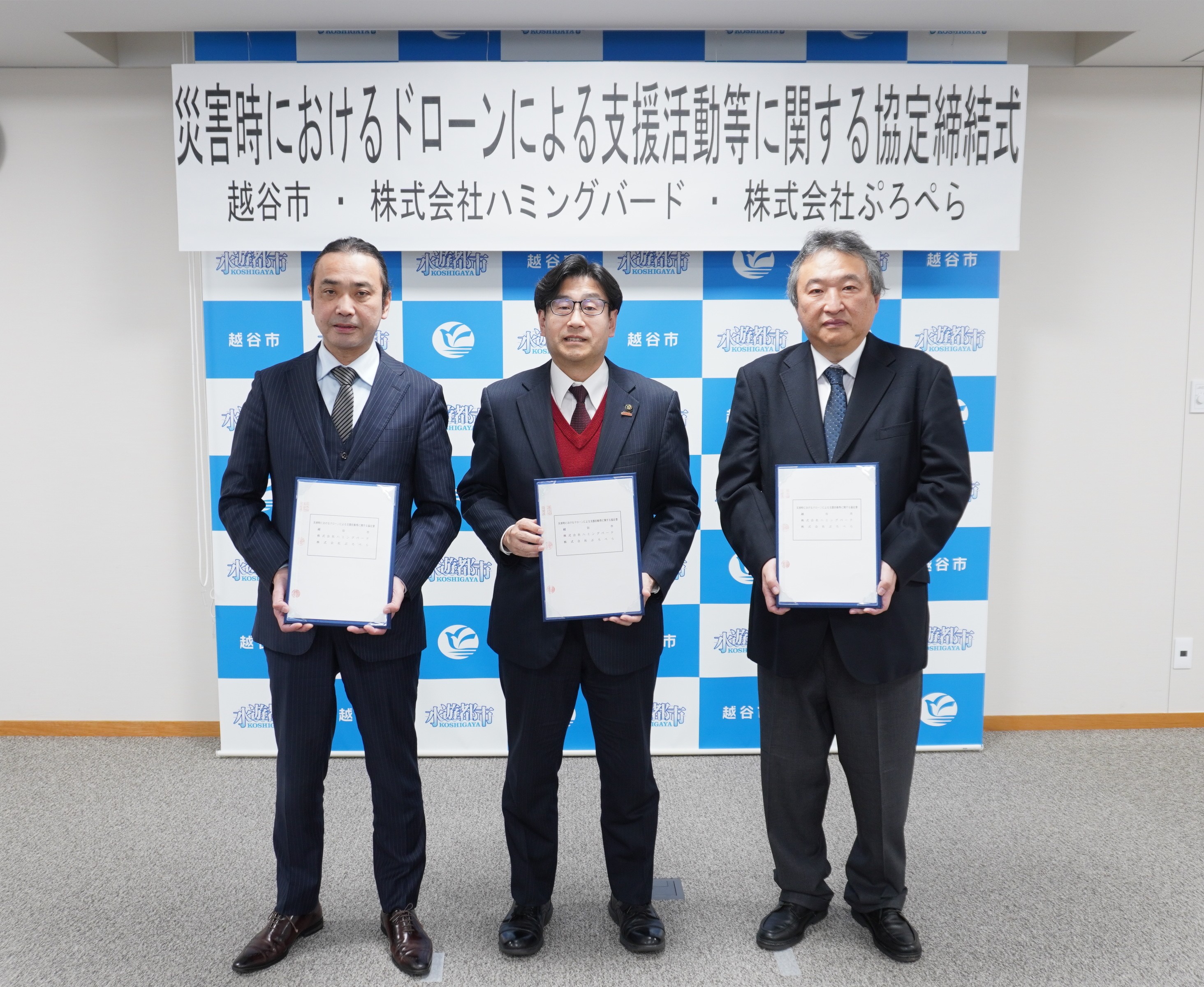 越谷市は、株式会社ハミングバードおよび株式会社ぷろぺらと令和8年(2026年)1月30日に「災害時におけるドローンによる支援活動等に関する協定」を締結しました。