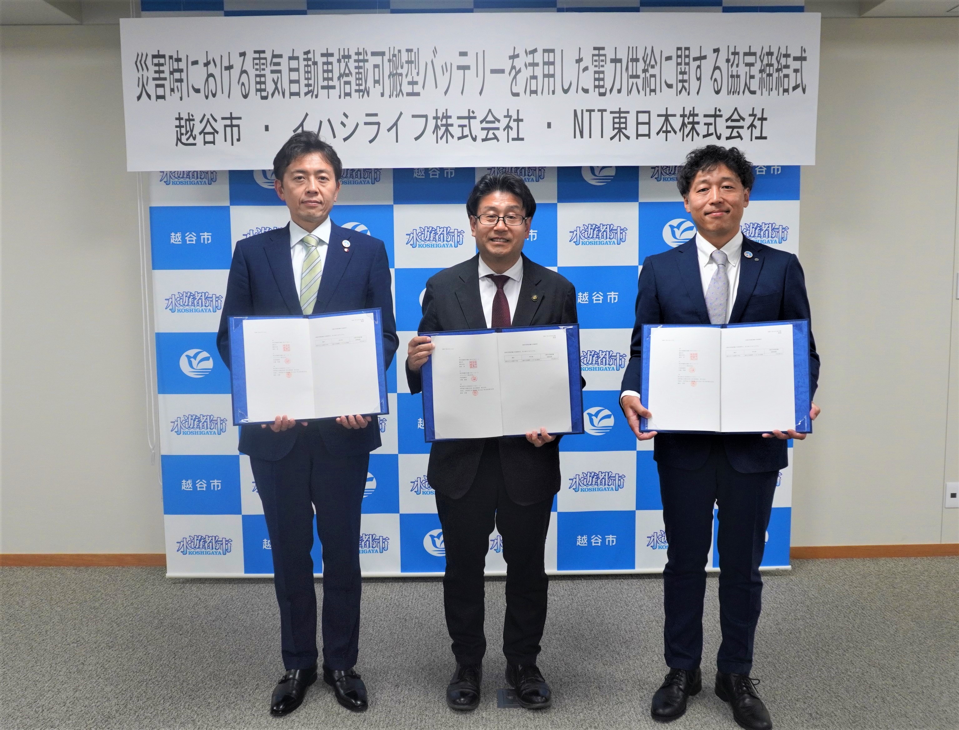 越谷市は、イハシライフ株式会社およびNTT東日本株式会社と令和7年(2025年)9月29日に「災害時における電気自動車搭載可搬型バッテリーを活用した電力供給に関する協定」を締結しました。