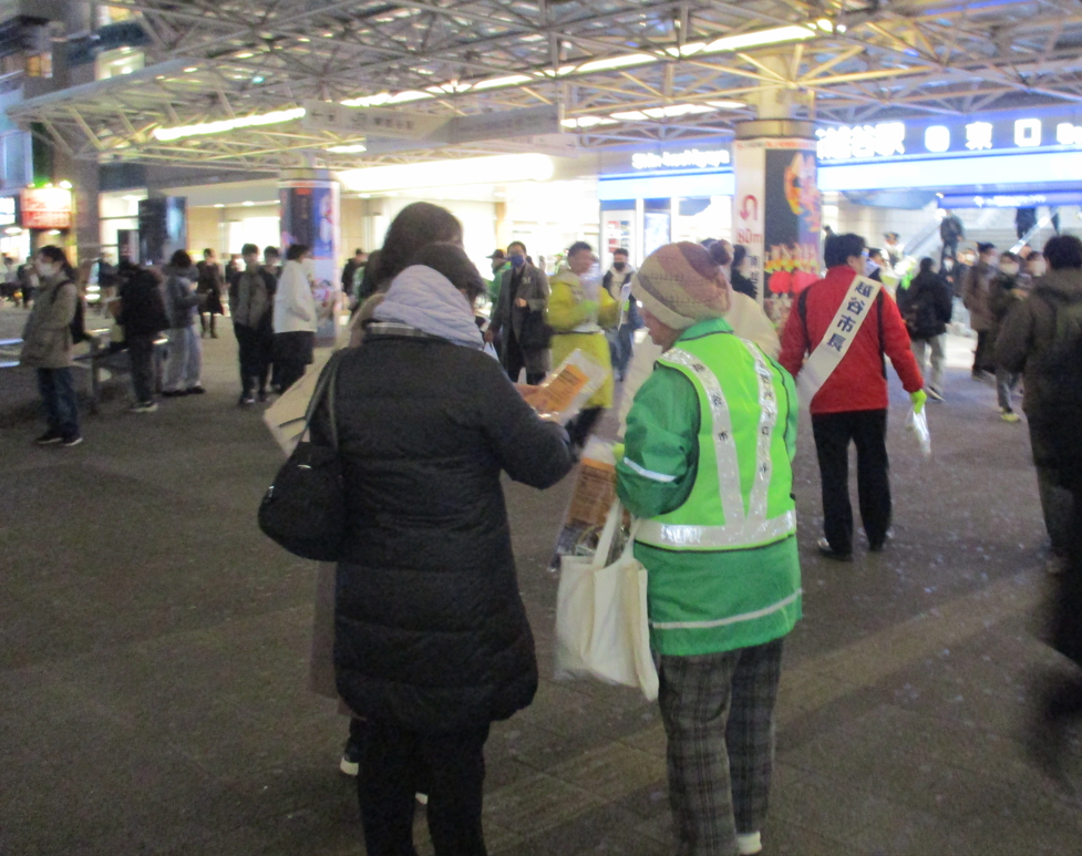 ■内容:上記の日時・場所において、駅周辺の歩行者に、防犯対策の呼びかけとともに、啓発品の配布を行いました。その後、市長、越谷警察署長、南越谷地区安全安心まちづくり推進協議会会長を先頭に、特殊詐欺被害やひったくり、自転車盗難、客引き被害防止のため、注意喚起を行いながら、徒歩でのパトロールを行いました。
