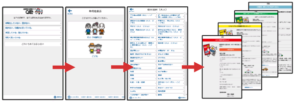 急な病気やけがをしたとき、該当する症状を画面上で選択していくと、緊急度に応じた必要な対応(「いますぐ救急車を呼びましょう」、「できるだけ早めに医療機関を受診しましょう」、「緊急ではありませんが医療機関を受診しましょう」又は「引き続き、注意して様子をみてください」)が表示されます。
