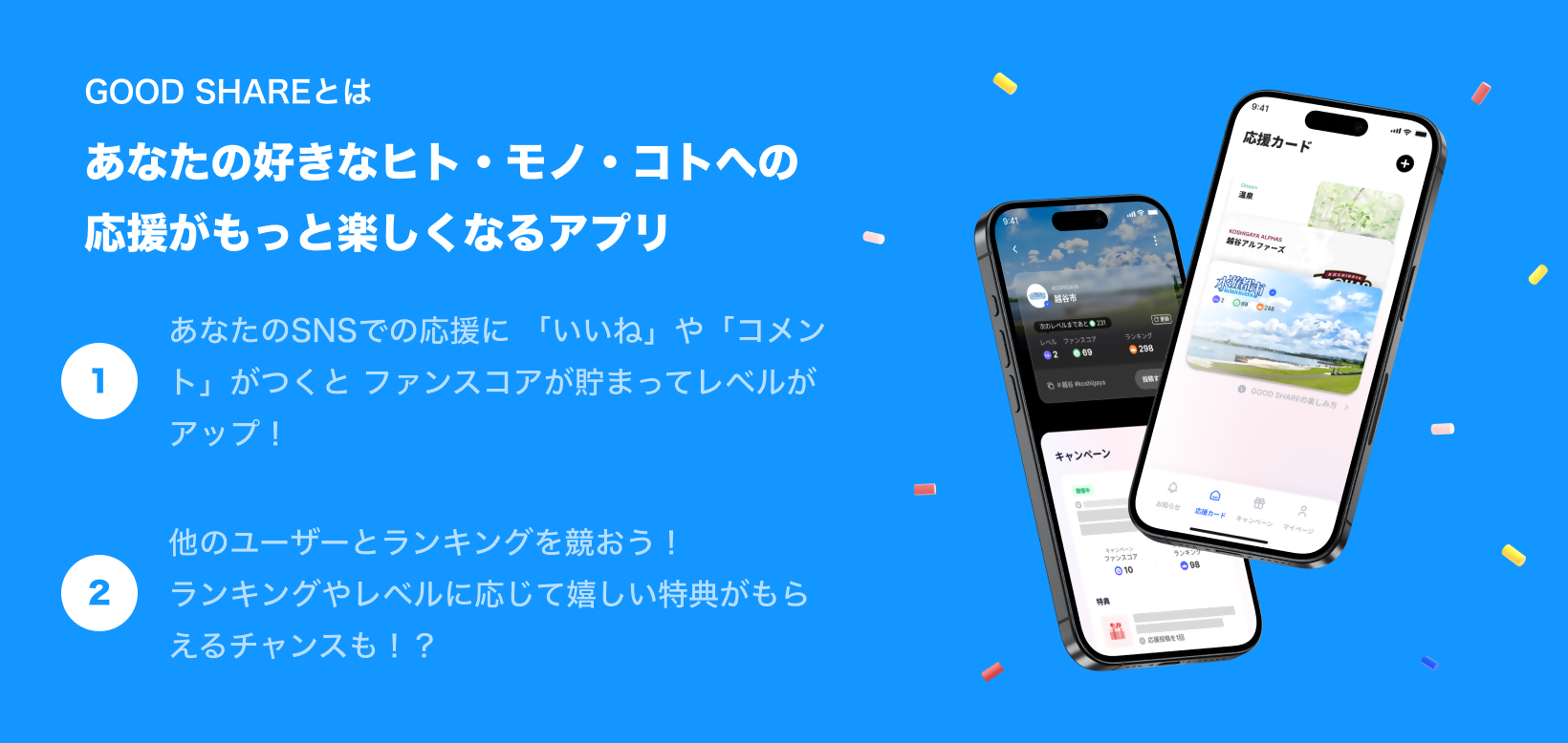 お手持ちのスマートフォンでGOOD SHAREアプリをダウンロードして、[キャンペーン開催中]から[越谷市]の応援カードを選択しよう
