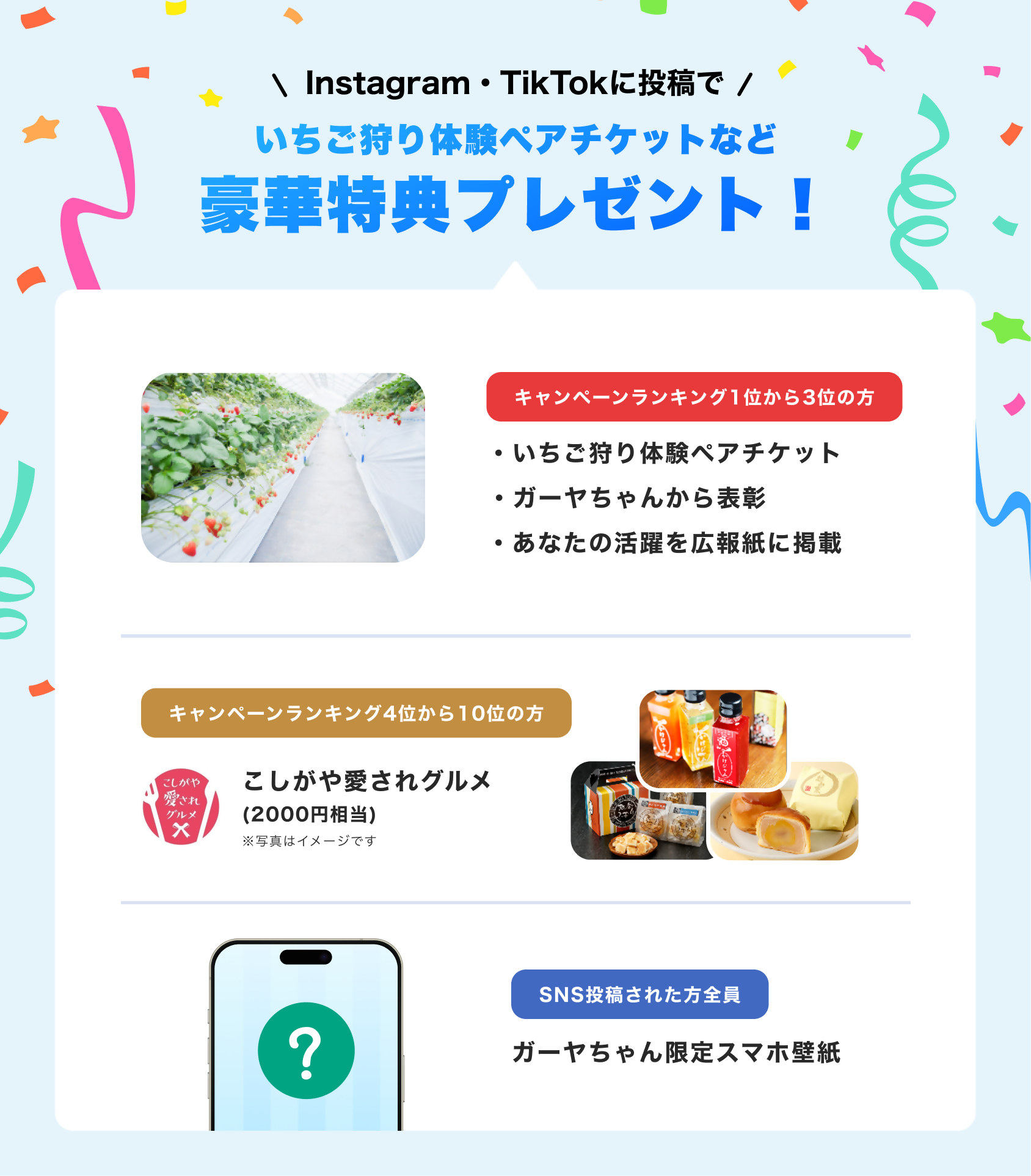 あなたが思う越谷のイチOSHI!をInstagramまたはTikTokに「#越谷」と「#イチoshiこしがや」の2つのハッシュタグをつけて投稿すると、スマートフォンアプリ「GOOD SHARE」のキャンペーンランキングに応じて豪華プレゼントがもらえるチャンス!