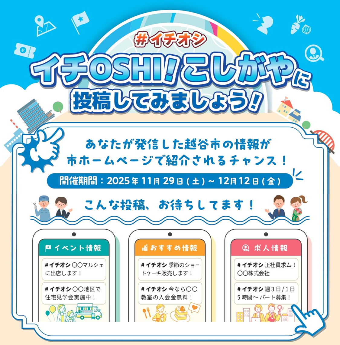 越谷市の情報ならだれでも、自由に投稿できる「イチOSHI!こしがや」に、あなたのイチオシなイベント情報、おすすめ情報、求人情報を投稿してみませんか?