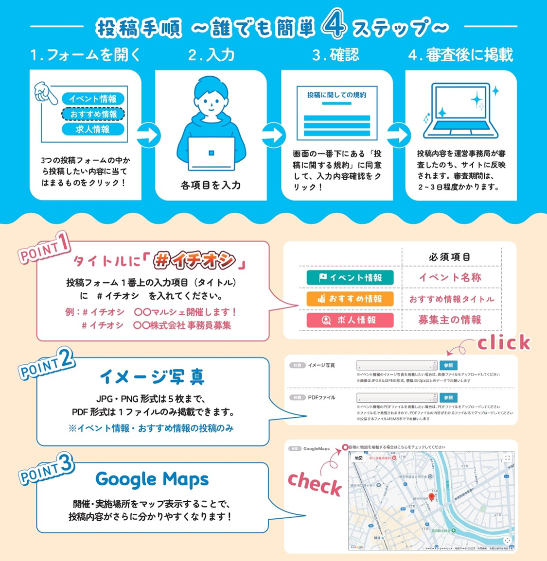 ※投稿いただいた情報は、「イチOSHI!こしがや」を官民協働事業として運営する株式会社サイネックスの運営事務局にて、投稿規約に沿った審査のうえ、掲載させていただきます。投稿から掲載まで最大5営業日をいただきますので、ご了承ください。