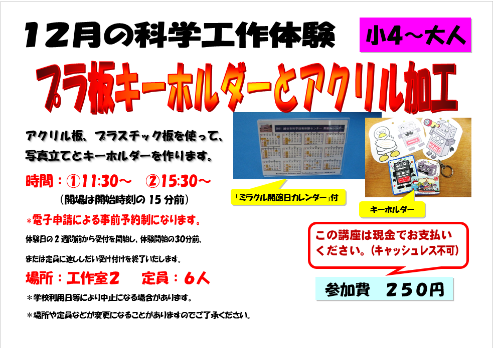 特別な支援を要する児童生徒をお預かりしている団体等のご参加については、事前に科学技術体験センターにお問い合わせください。なお、毎日の科学工作実験体験とは別に、団体だけで科学工作体験を希望される場合は、「団体のお客様へ」をご覧ください。