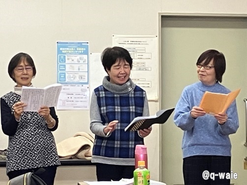 当日は3時間の練習でしたが、メンバーの皆さんが楽しそうに参加されていました。皆さんが楽しみながら、先生と一つの物語を作り上げていることが、聞き手の感動につながっているのだと思いました。これからも皆さんが作り上げる舞台を楽しみにしています。