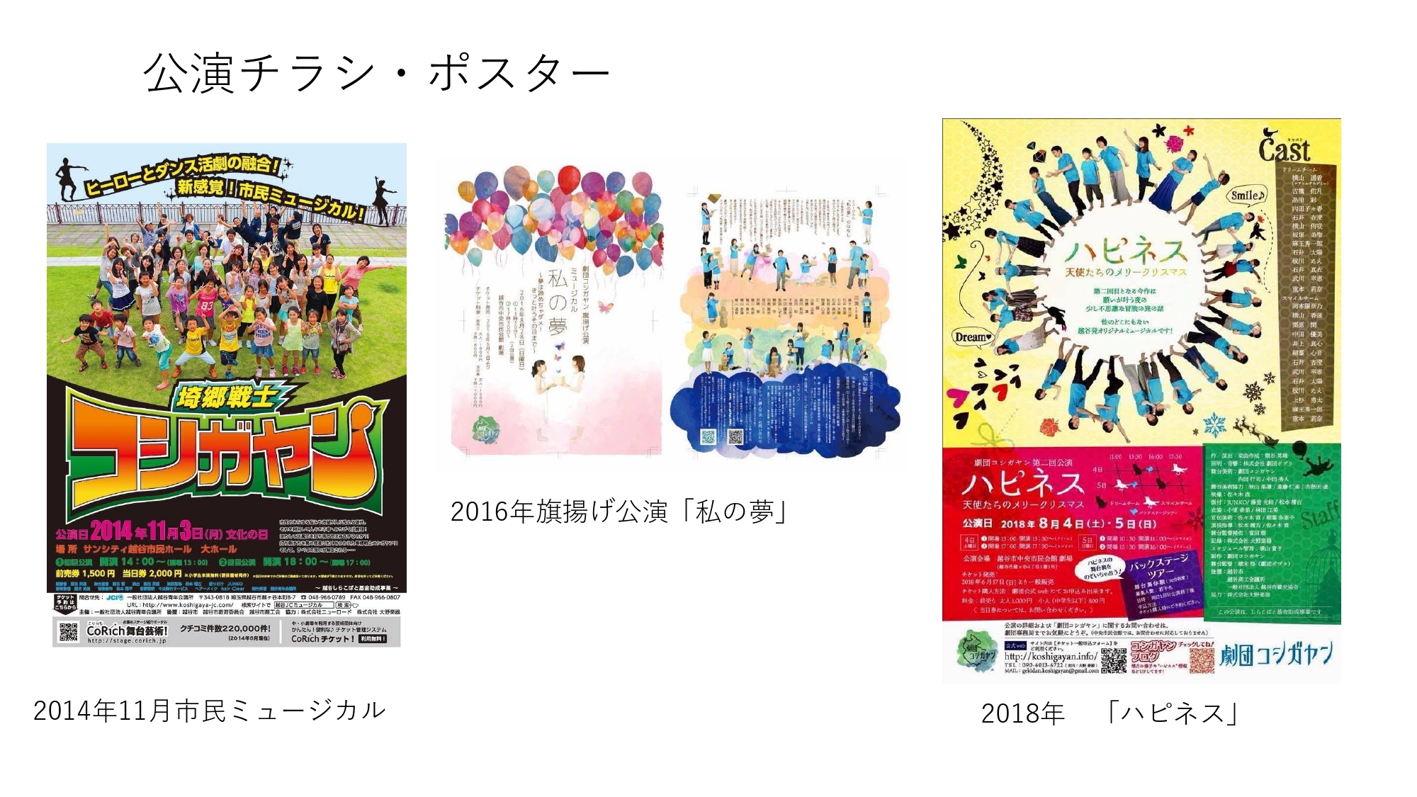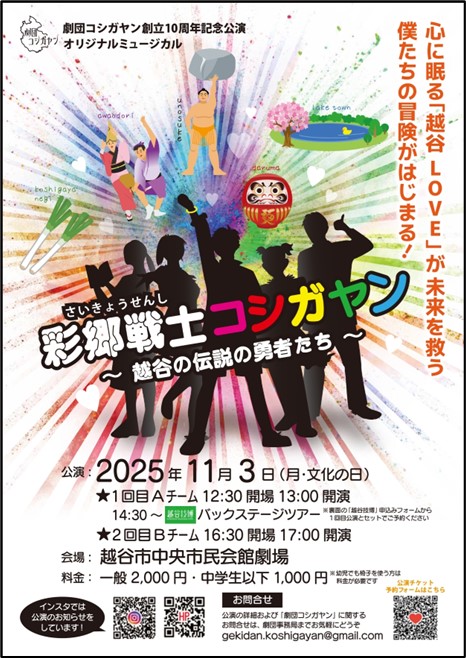 ---2014年11月3日、サンシティ大ホールで約50人のキャストによる市民ミュージカル「埼郷戦士コシガヤン」が上演されました。青年会議所主催、当時の理事長(浜野世嗣氏)が、どうしても市民ミュージカルを実現したい!と各方面へ働きかけて、多くの人の協力のもと開催。2回公演で約2,000人の来場者を動員し、大成功を収めました。