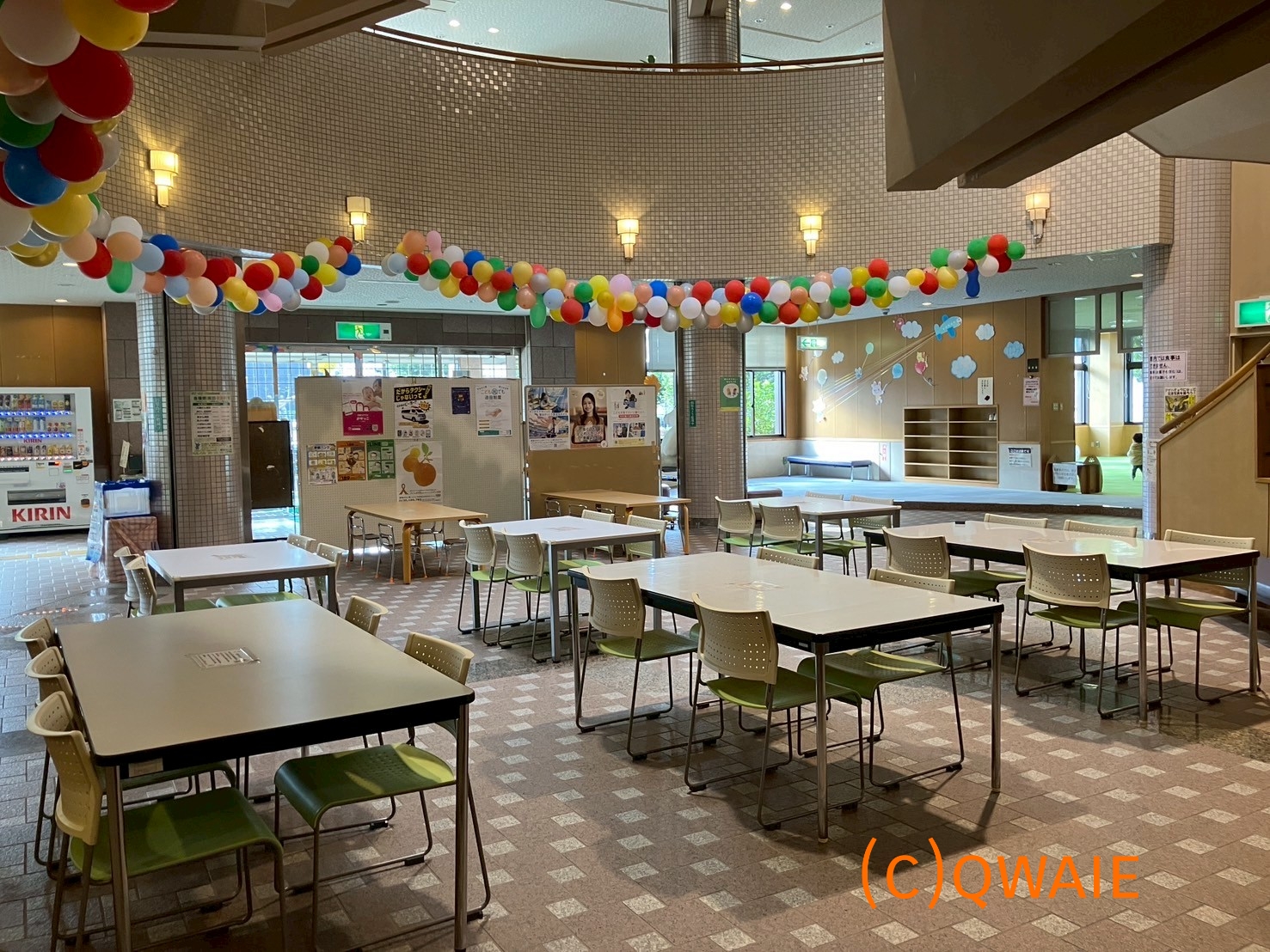 ホールで貸出のゲームで遊んだり、水分補給、勉強する学生さんもいます。 取材日はイベント後のため風船で装飾されていましたが普段は無いそうです。