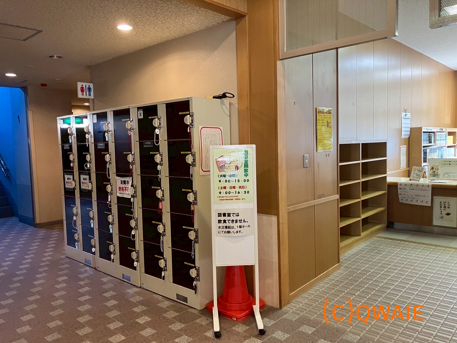 図書室の入口横にコインロッカーがあります。100 円必要ですが返却式です。