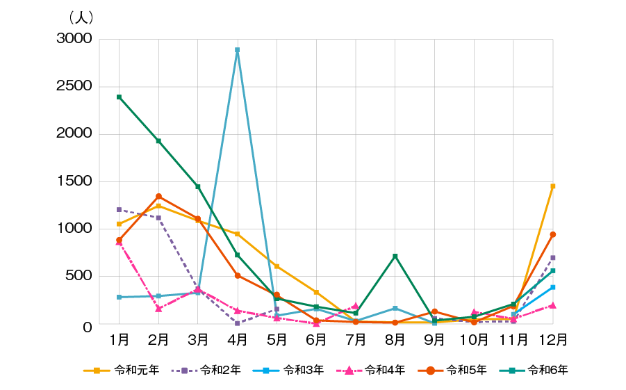 (グラフ)全国のノロウイルスによる食中毒発生状況(月別発生状況)