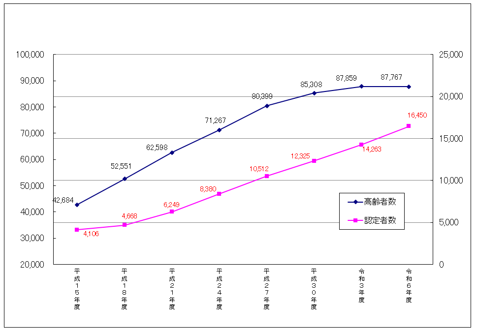 越谷市の高齢者数(65歳以上)と要介護認定者数の推移