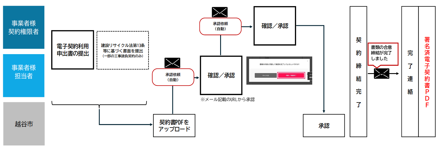 ・紙の契約書に印鑑を押す代わりに、電子文書(PDF 形式の契約書)に電子署名とタイムスタンプを付与し て契約を締結する仕組みです。