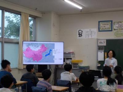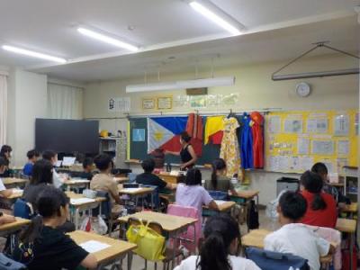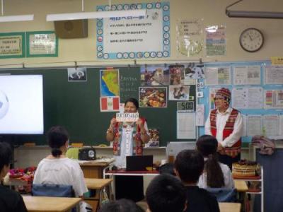 今回、宮本小学校では6年生を対象に、中国、フィリピン、ペルーの3か国について紹介しました。講師が写真や小物を使い説明すると、生徒の皆さんは異なる文化を熱心に学んでいました。