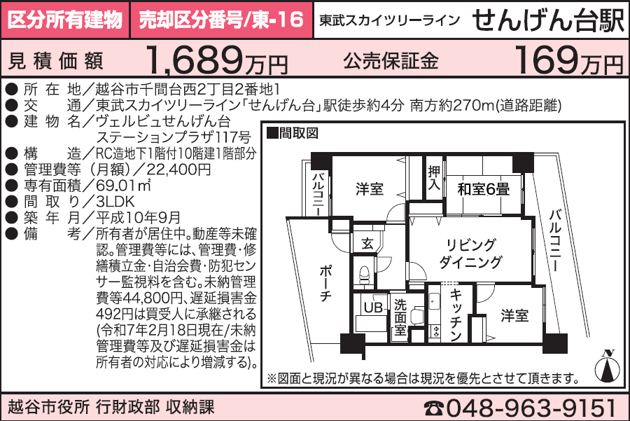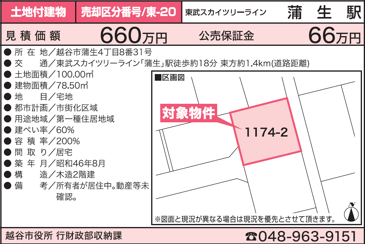 越谷市では、滞納処分による不動産公売を実施します。なお、入札には一般の方も参加できます。買受希望がありましたら、公売(入札)にご参加ください。