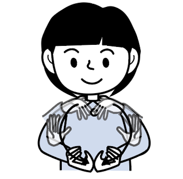 (2)読書 両手の手のひらを合わせ、小指側を軸にして両手を開き、 左手の手のひらに向けた右手2指の指先を2回下ろす ![]() |
