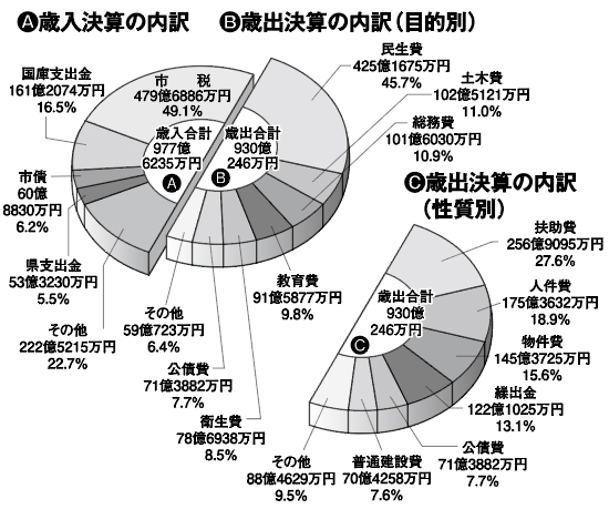 歳出は、27年度に比べ4億5918万円減の930億246万円で、23年度にスタートした第4次総合振興計画に基づき、「水と緑と太陽に恵まれた 人と地域が支える安全・安心・快適都市」の実現を目指し、各種事業を推進しました(主な事業は5面に掲載しています)。