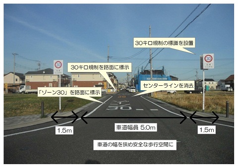 車道幅員 を5.0メートルに抑制、路側帯 を確保 - ゾーン30を路面に標示